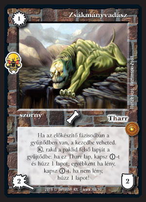 Szöveg: Ha az előkészítő fázisodban a gyűjtődben van, a kezedbe veheted. (K), rakd a paklid felső lapját a gyűjtődbe: ha ez Tharr lap, kapsz 1_VP-t és húzz 1 lapot; egyébként ha lény, kapsz 1_VP-t, ha nem lény, húzz 1 lapot!