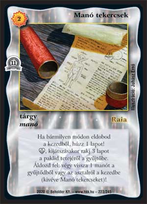 Szöveg: Ha bármilyen módon eldobod a kezedből, húzz 1 lapot! _etnikum, kijátszásakor rakj 3 lapot a paklid tetejéről a gyűjtőbe. Áldozd fel: végy vissza 1 manót a gyűjtődből vagy az asztalról a kezedbe (kivéve Manó tekercseket)!