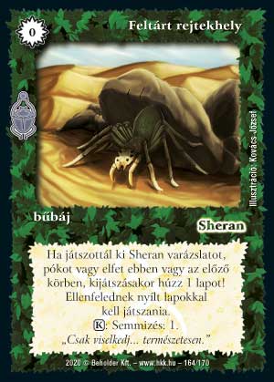 Szöveg: Ha játszottál ki Sheran varázslatot, pókot vagy elfet ebben vagy az előző körben, kijátszásakor húzz 1 lapot! Ellenfelednek nyílt lapokkal kell játszania. (K): Semmizés: 1.